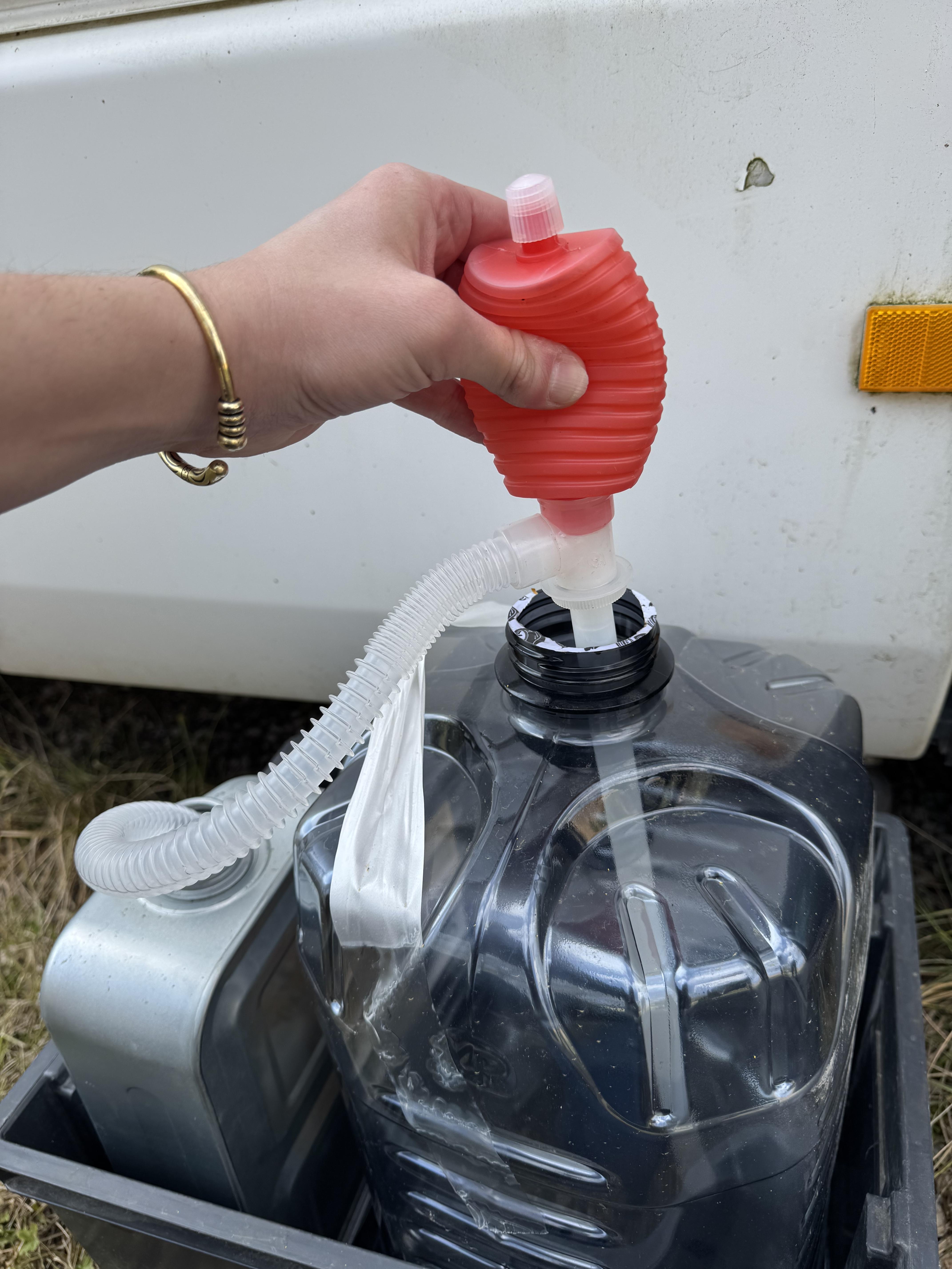 - Dévissez le réservoir. A l’aide de la pompe rouge, embout rigide à insérer dans le bidon de pétrole, embout flexible dans le réservoir.